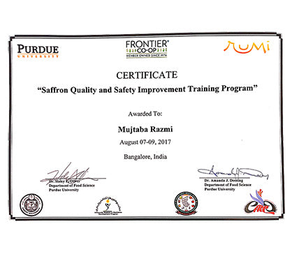 In 2015, he worked with Purdue University, Frontier Co-op, and Rumi Spice on saffron food-safety and quality improvement projects.